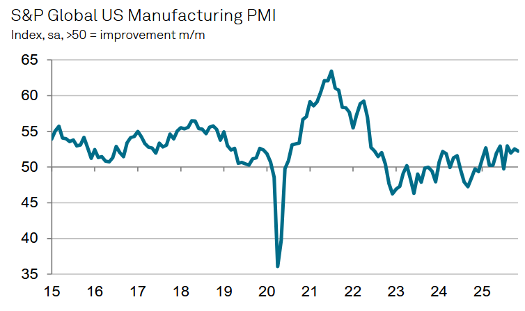 And it concluded: “Encouragingly, manufacturers have grown more optimistic about the year ahead, with the ending of the government shutdown helping lift confidence from the sharp drop suffered in October. Optimism is being fueled by hopes of improved policy support, including lower interest rates, as well as greater political stability, though it is clear that uncertainty remains elevated and a drag on business growth in many firms, holding confidence well below levels seen at the start of the year.”