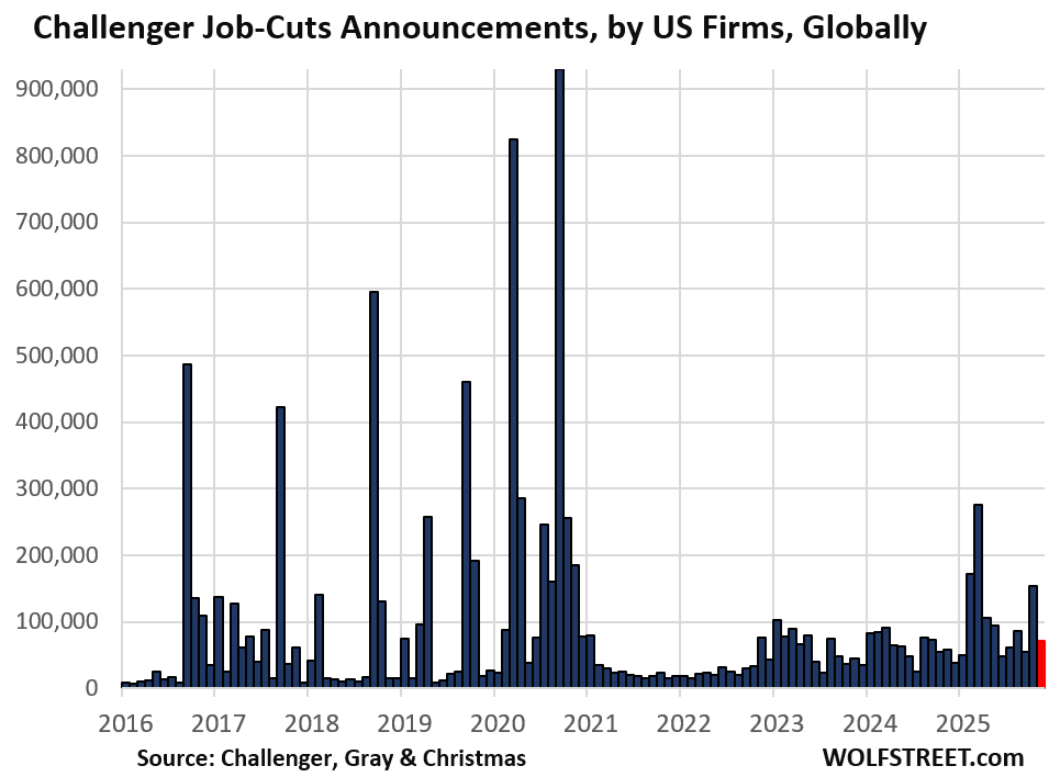 When Amazon announced in late October that it would lay off 30,000 people of its global workforce – with an undisclosed portion to take place in the US, and the rest globally – it pumped up the Challenger Jobs Cut report to 153,000, even though those layoffs hadn’t happened yet, and not all might happen, and even though only some of the layoffs will take place in the US, and even though Amazon was hiring through the other door.