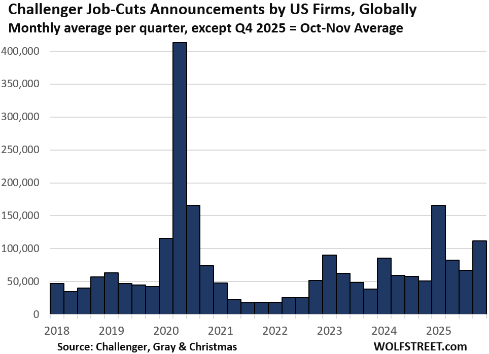 The Challenger Job Cuts Report, also out this morning by outplacement firm Challenger, Gray & Christmas, tracks layoff announcements by US companies of their global workforce. So these are not actual layoffs, but announcements of potential future layoffs globally.