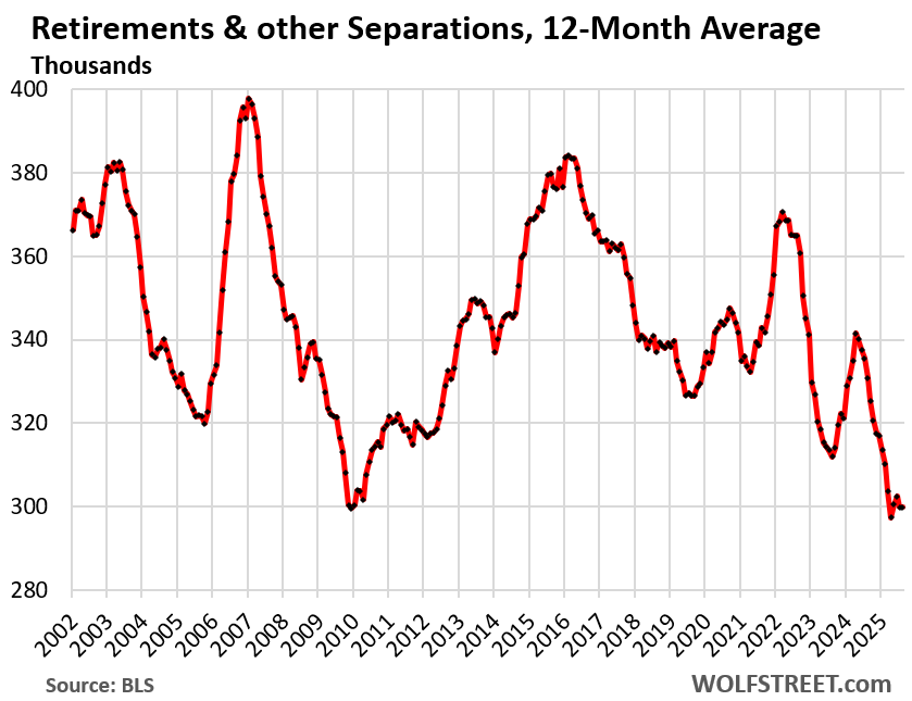Retirements are historically LOW. This year, they averaged 302,000 a month. There was a spike in 2021 and 2022. But there had been a bigger spike in 2015/2016, and an even bigger spike during the Great Recession (12-month average, JOLTS data):