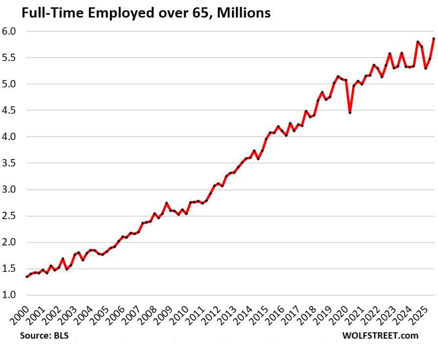 The number of people over 65 with fulltime jobs (not retired, LOL) has continued to rise and hit a record 5.86 million in Q3 2025, which proudly and happily includes me. Many of them also receive Social Security benefits. This does not even include those who are between 62 and 65, and are working, and may also have applied for SS benefits.