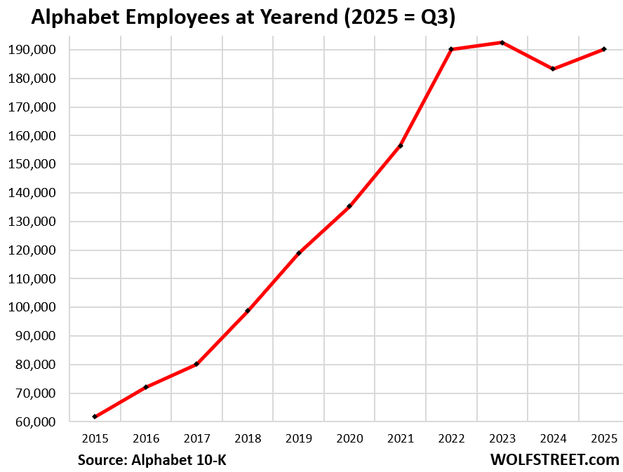 Alphabet, which discloses the headcount in its quarterly filings, reported 190,167 employees globally at the end of Q3, up from yearend 2024, and flat with yearend 2022.