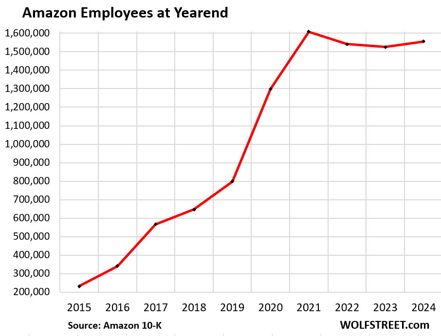 Amazon, which discloses global yearend headcount in its annual reports, had 1.56 million employees at yearend 2024, slightly higher than in the prior two years but below the peak in 2021 (1.61 million).