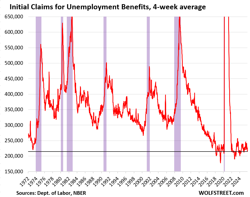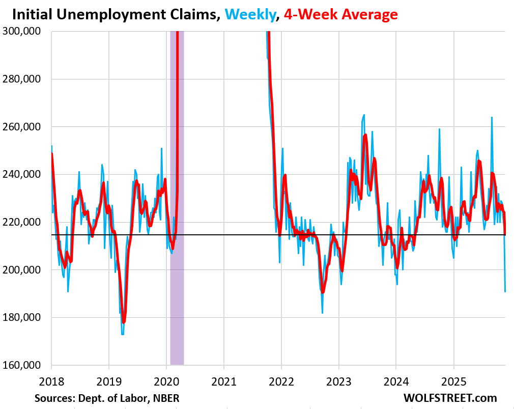 Initial applications for unemployment benefits (“initial claims”) in the week through Saturday plunged from already low levels, in an outlier move, by 27,000 from the prior week to 191,000, seasonally adjusted, the lowest since 2022 (blue line in the chart).