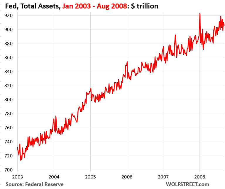 The chart below shows the Fed’s balance sheet from January 2023 until the bankruptcy of Lehman Brothers in September 2008. What gave total assets this jagged line were the repo transactions that varied dramatically from day to day, as the Fed attempted to actively manage short-term interest rates by adding or removing liquidity from the banking system via repos with its counterparties.