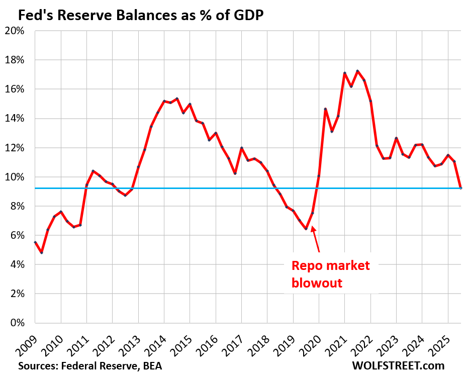 Reserve balances of $2.86 trillion have dropped to 9.2% of GDP currently, from the peak of 17.3% at the peak in Q3 2021.