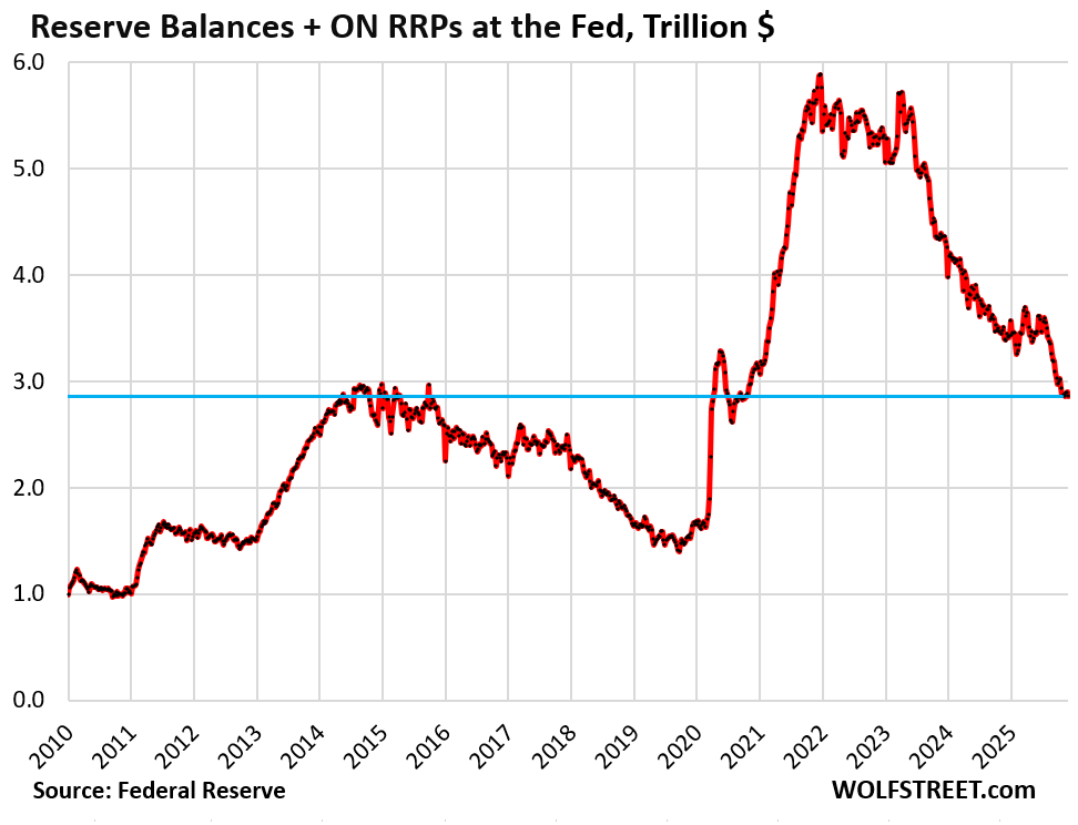 The combined liquidity (reserve balances plus ON RRPs) had peaked at $5.87 trillion in December 2021, when QE was ending. It has now plunged by $3.02 trillion, to $2.86 trillion, with ON RRPs being near zero: