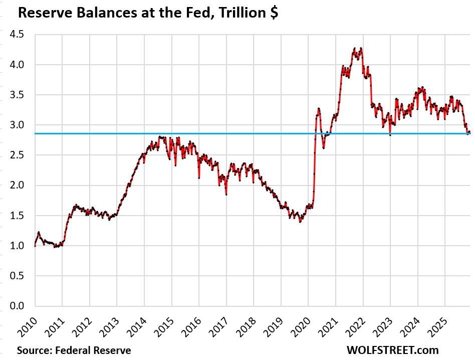 Reserve balances are cash that banks have put on deposit at the Fed in their reserve accounts – sort of big checking accounts at the Fed. Banks pay each other through these accounts daily in vast sums, and they earn interest on their balances. The rate of Interest on Reserve Balances (IORB) is one of the Fed’s five policy rates, and with the October rate cut was set at 3.9%.