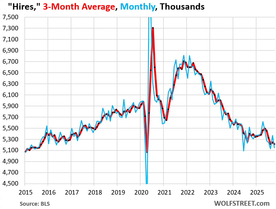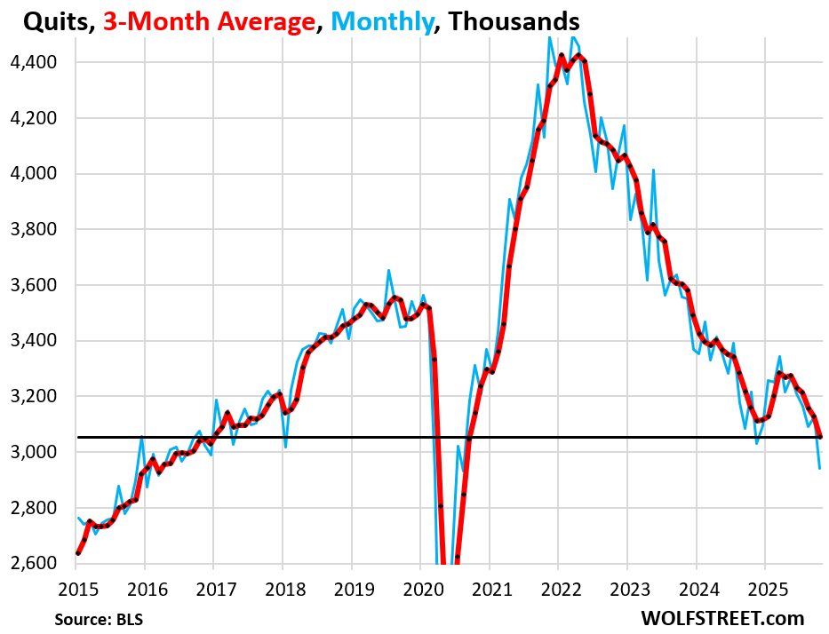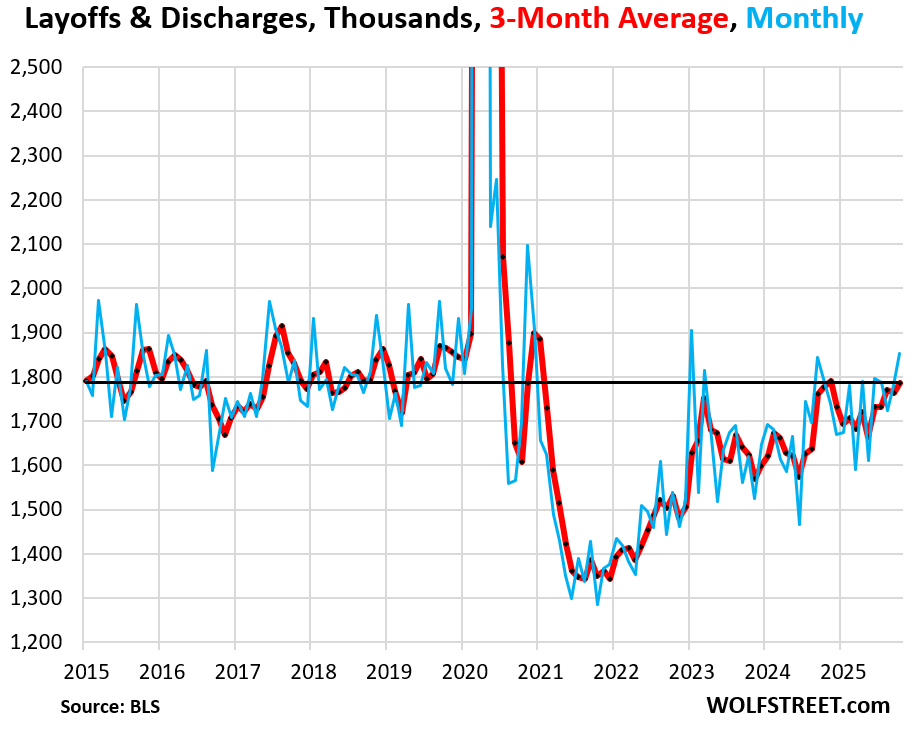 Layoffs & discharges rose by 129,000 in October from August, to 1.85 million, in the middle of the pre-pandemic range. The three-month average rose to 1.79 million, the highest since November 2024, but still at the lower portion of the pre-pandemic range.