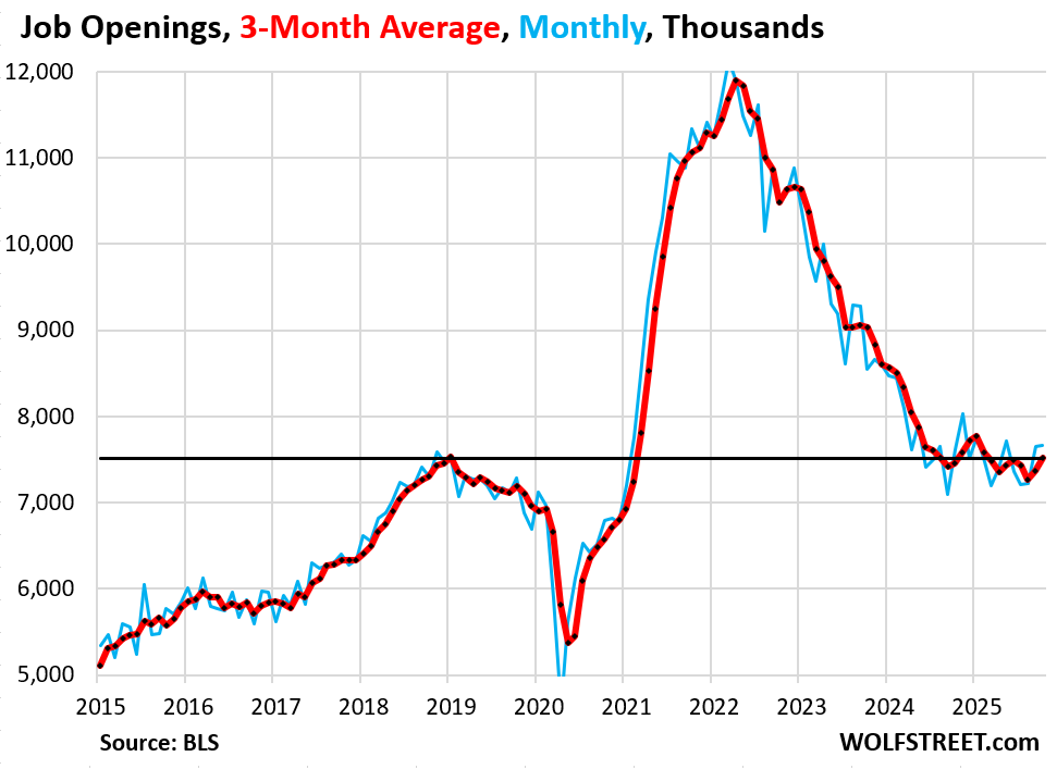 Due to the government shutdown, there is no good figure for job openings in September, and the September release was canceled, but “partial data that businesses self-reported electronically” was included in today’s October release, according to the Bureau of Labor Statistics. The October data were collected as normal in November. So month-to-month comparisons for October lack a solid base (September data is only partial). August was the last complete data set (7.73 million job openings), and the August-to-October comparisons are valid, and that’s how we’ll get around the September “partial data” issue.