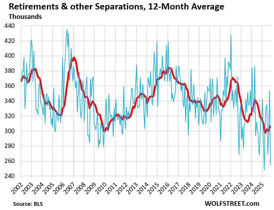 The retirement waves are over. Other separations (retirements, deaths while employed, etc.) totaled 255,000 in October, at the very low end of the 25-year range.