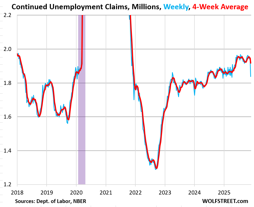 These “continued unemployment claims” plunged by 99,000 in the latest week – a huge outlier plunge that will at least partly reverse in a week or two – to 1.838 million, the third week in a row of declines, seasonally adjusted (blue in the chart below).