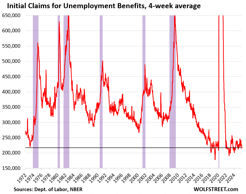 Which is why we look at the four-week average, which largely irons out the week-to-week squiggles, and which ticked up to 216,750, seasonally adjusted, which is historically low, and in the same low range that it has been in for the past four years.