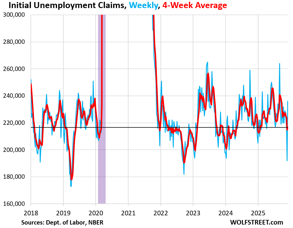 Initial applications for unemployment benefits (“initial claims”) in the week through Saturday bounced back to a still relatively low 236,000, from the outlier-plunge last week, seasonally adjusted, that had caused me to note, “initial unemployment insurance claims were a doozie that’ll reverse next week,” and they did today.