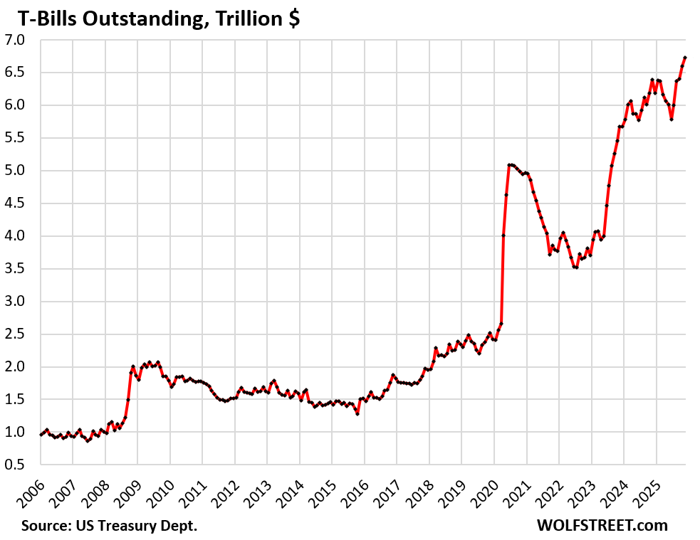 T-bills outstanding hit a record $6.7 trillion at the end of November, up by 18.6% from a year ago.