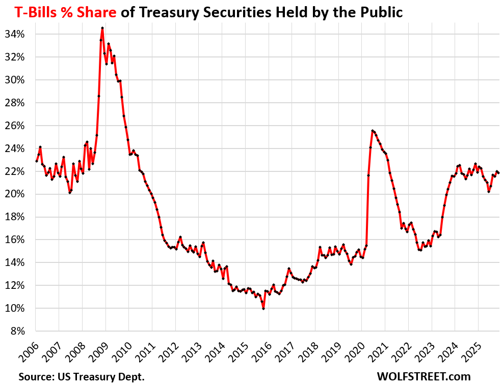 But the total amount of “Treasury securities held by the public” – not including those held by government entities, such as government pension funds and the Social Security Trust Fund – also ballooned to a new record of $30.8 trillion at the end of November, on substantial new issuance, and month-to-month, the share of T-bills actually dipped a hair to a share of 21.8% of all Treasuries held by the public.