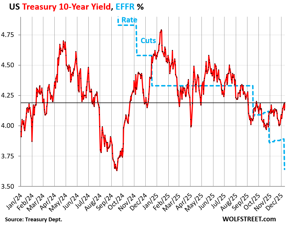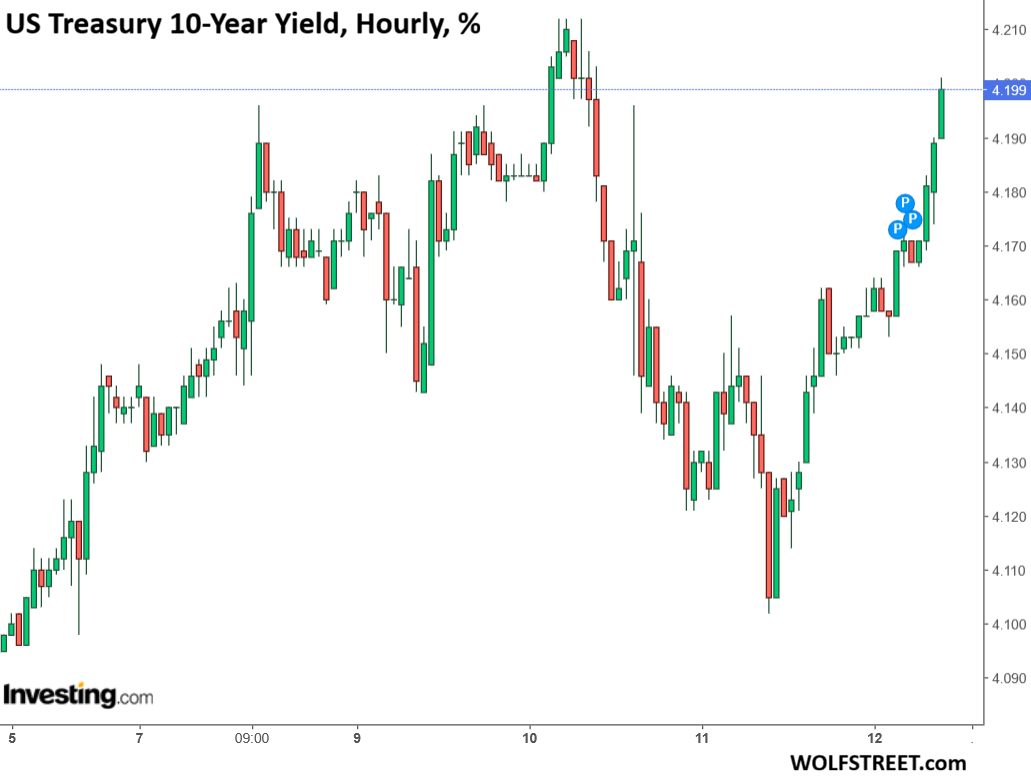 By early Wednesday, in the secondary market, the 10-year Treasury yield had gone over 4.21%. Then came the FOMC meeting, the rate cut, the T-bill purchases, and Powell, and the yield dropped 10 basis points but bottomed out at 4.10% by early Thursday. Then it bounced off and rose, and at the moment, Friday morning, was back to 4.20% (hourly chart via Investing.com).