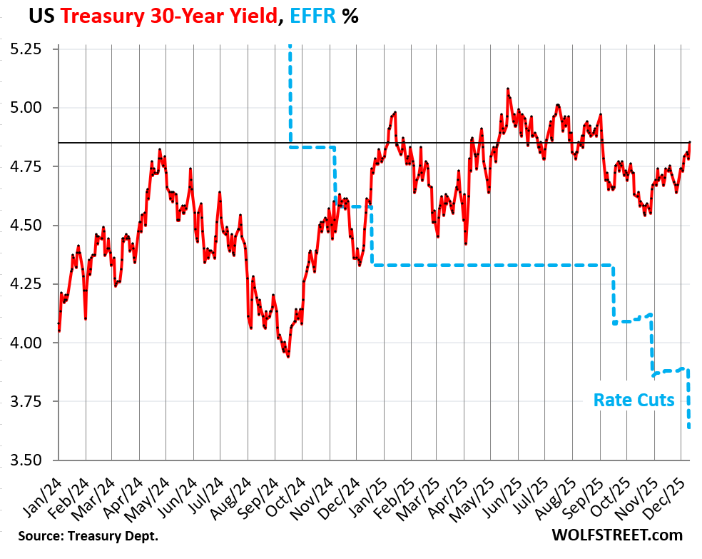 By Thursday evening, in the secondary market, the 30-year Treasury yield was back at 4.80%, and by this morning it rose to 4.86%, the highest since September 4. It’s almost funny how the 30-year yield blows off the Fed’s rate cuts. It’s all about inflation fears and supply fears: