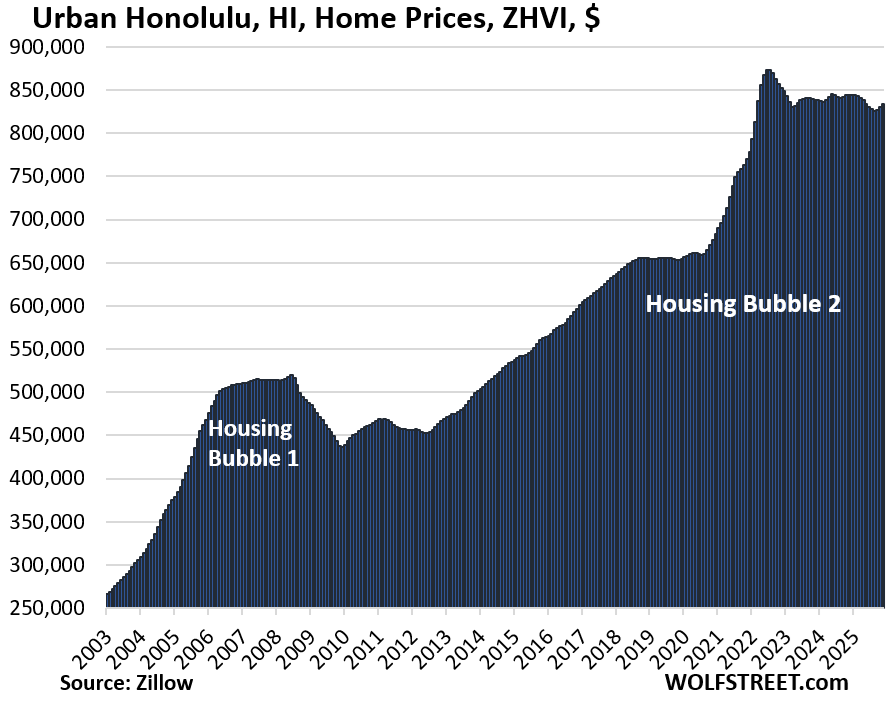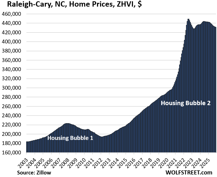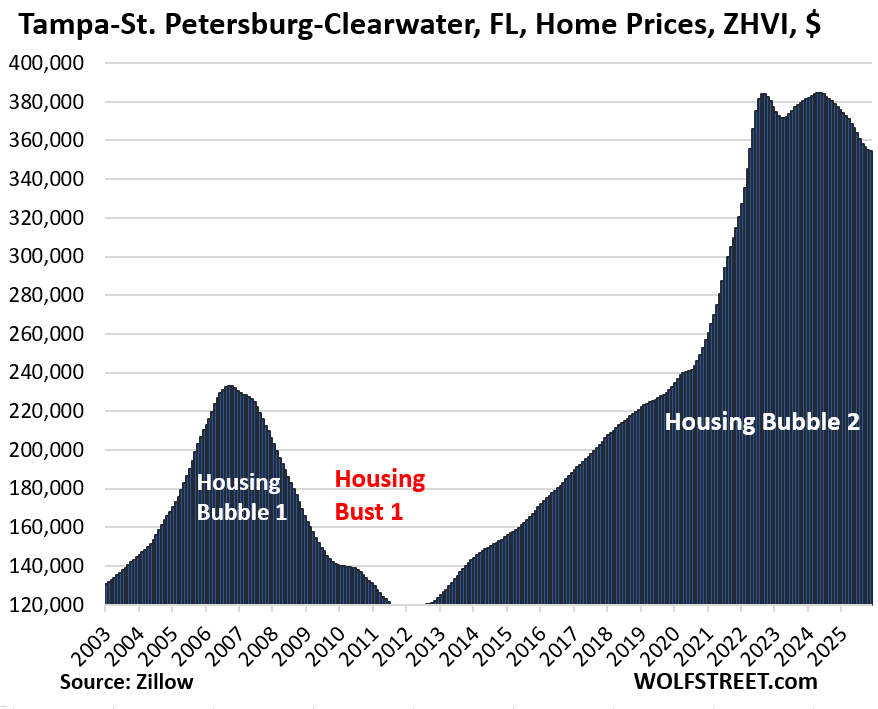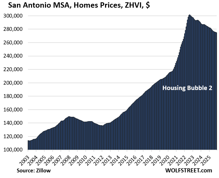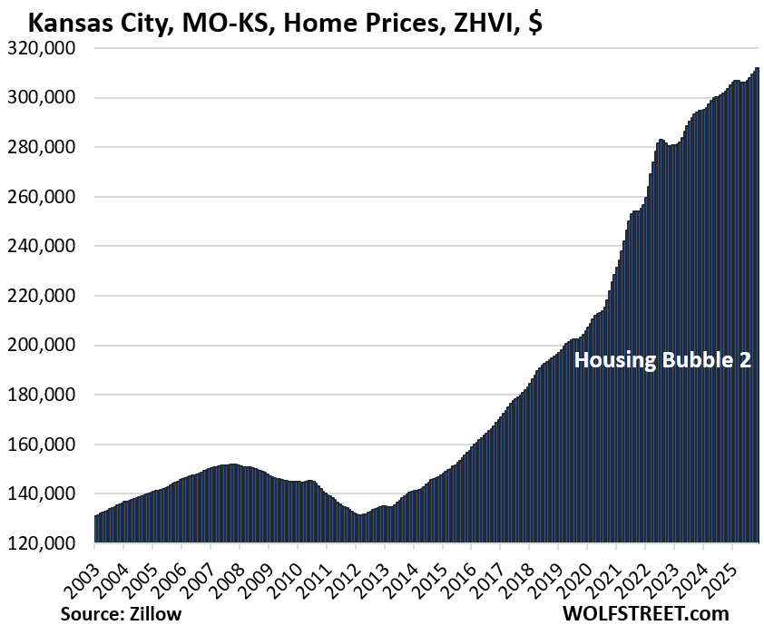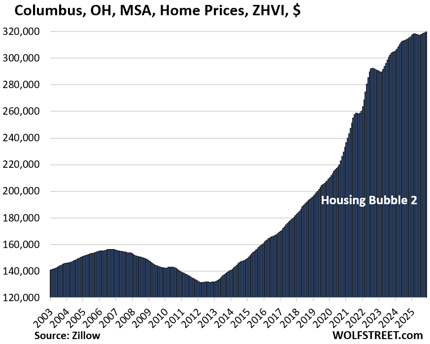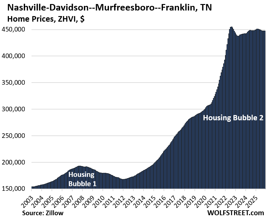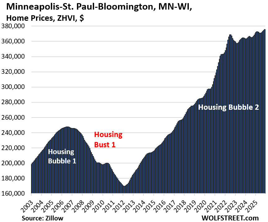 To qualify for the 33 most splendid housing bubbles, the MSA must be one of the largest by population and must have had home prices of at least $300,000 at some point. Some metros that are large enough don’t qualify for this list because home prices never reached $300,000, despite the blistering surge of home prices in recent years, such as the metros of New Orleans, Memphis, Oklahoma City, Tulsa, Cincinnati, and Pittsburgh.