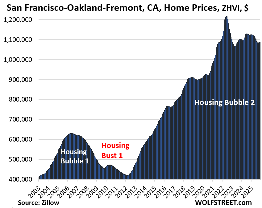 In some markets, prices of mid-tier single-family homes, condos, and co-ops have sunk substantially from their peaks in 2022, 2023, or 2024. In other markets prices have continued to rise, though at a much slower pace than in 2021 and 2022. Here we track 33 large and expensive markets by Metropolitan Statistical Area or MSA (Census-designated urban areas often consisting of multiple cities).