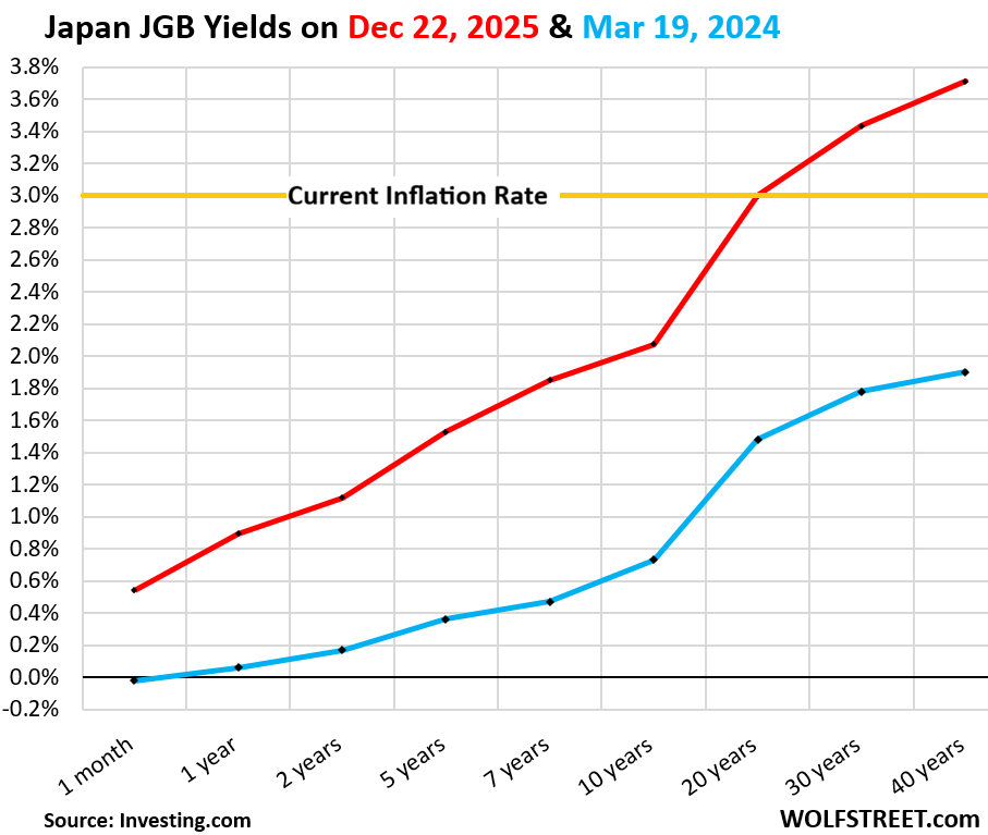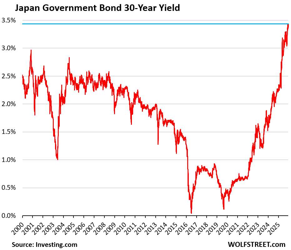 To get a positive “real” yield at current rates of inflation, investors have to buy 25-year or longer maturities (everything above the yellow line in the chart above). These investors are now grappling with the prospect of continued and possibly hotter inflation and with the scary notion that the BOJ, which has been engaging in QT since mid-2024, surrounded by inflation, will not step back into the bond market with its relentless bid that would push bond prices back up and yields back down. That era may be over.