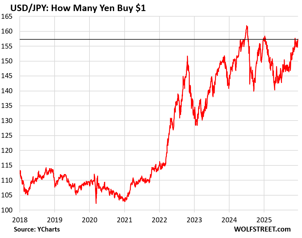 The yen carry trade has long thrived and along the way helped drive up asset prices in the US, and drive down US Treasury yields, as everyone from big Japanese institutions and US hedge funds, down to Japanese households, borrowed cheaply in yen, bought USD with those yen, and then bought US Treasury securities, stocks, cryptos, etc. It’s a leverage bet with multiple layers of risks.