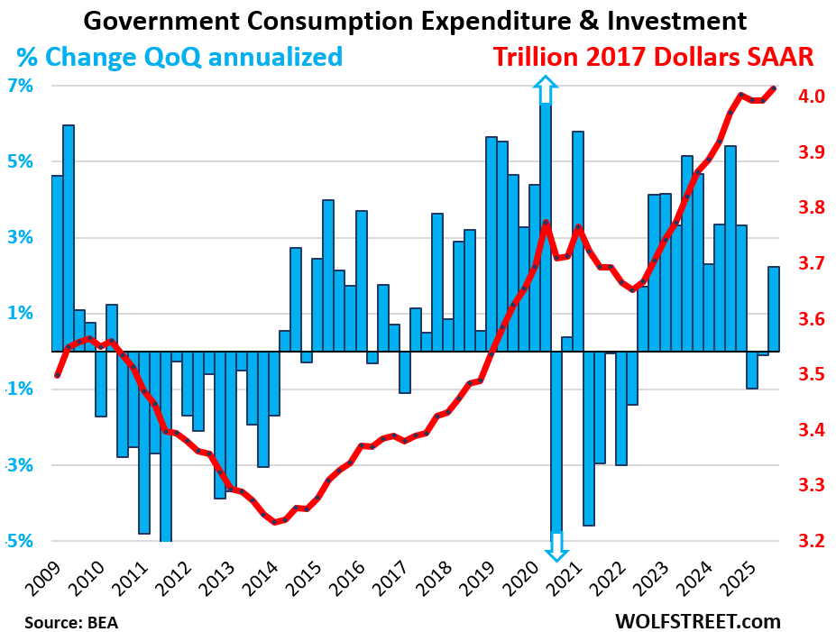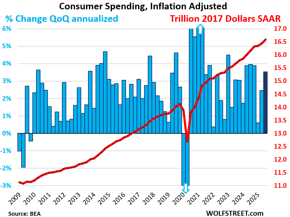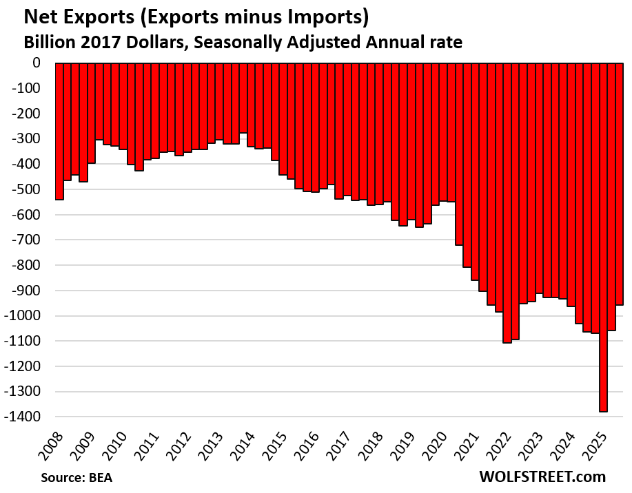 The decline in Q1 had been driven by an explosion of imports due to tariff frontrunning. Imports deduct from GDP; exports add to GDP. But that frontrunning of tariffs in Q1 and other trade shifts due to tariffs caused a dramatic improvement of the trade deficit in Q2 and Q3, from the horrible levels of Q1, contributing substantially to the high growth rates in both quarters.