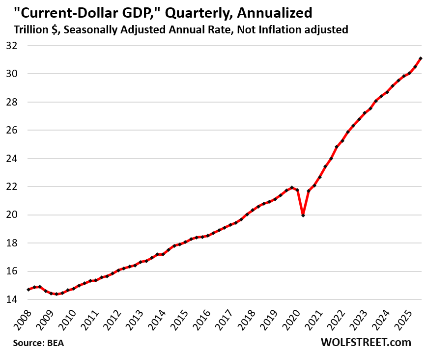 Not adjusted for inflation, “current-dollar GDP” grew by an annual rate of 8.2% to $31.1 trillion, after the 6.0% growth in Q2.
