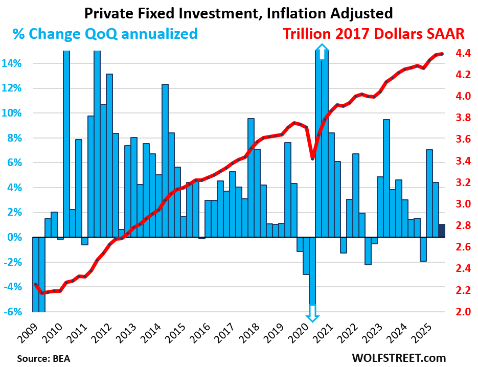 Private fixed investment, which excludes changes in inventory, rose by only 1.0% annualized and adjusted for inflation, after having jumped by 4.4% and 7.1% in the prior two quarters. Of which: