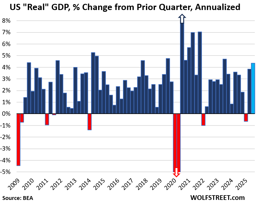 And WOOSH went the economy in Q3. Gross Domestic Product, the broadest measure of the economy, grew by an annual rate of 4.3% in Q3, adjusted for inflation, after the 3.8% growth in Q2, and the -0.7% decline Q1, according to the Bureau of Economic Analysis today.