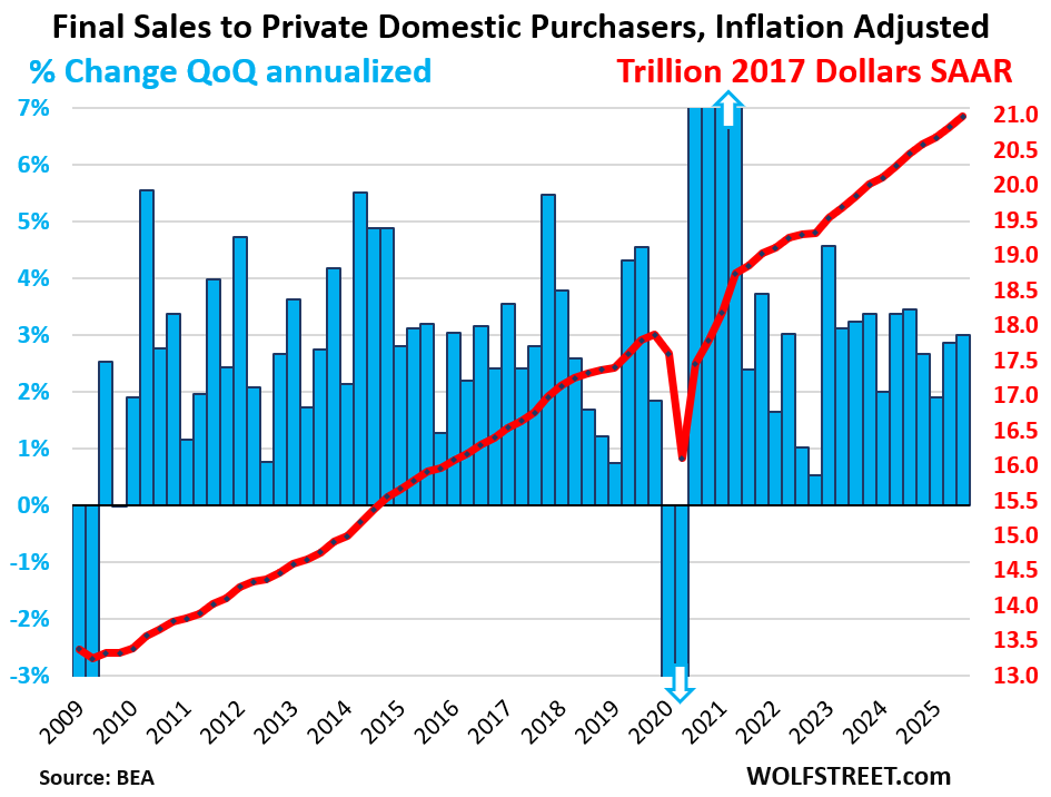 Final sales to private domestic purchasers rose by an annual rate of 3.0% in Q3, the best growth rate since Q4 2024, to $21.0 trillion.