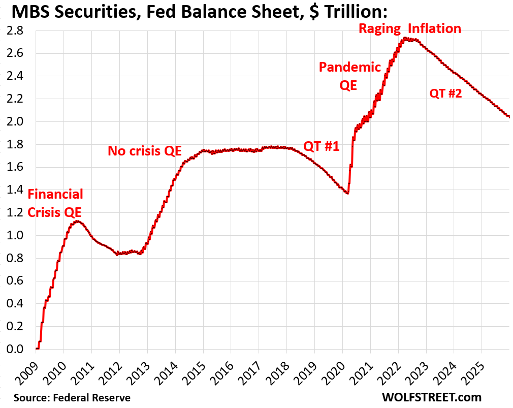 The Fed holds only “agency” MBS that are guaranteed by the government (issued by Fannie Mae, Freddie Mac, Ginnie Mae), where the taxpayer would eat the losses when borrowers default on mortgages.
