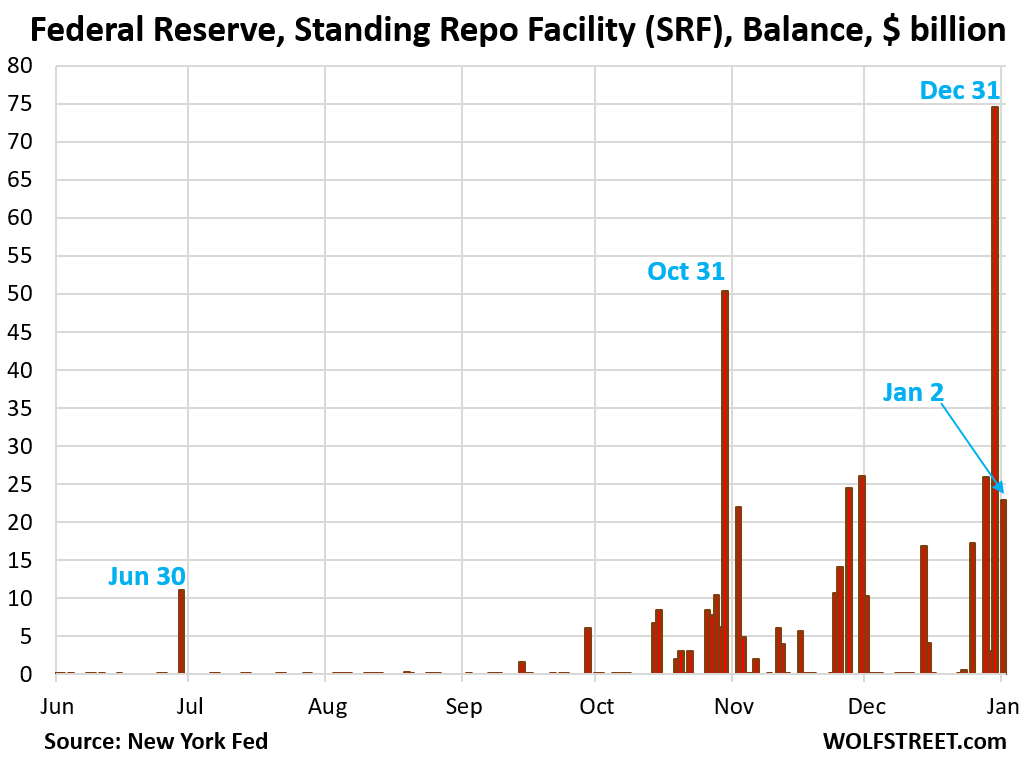 The Standing Repo Facility (SRF) saw an uptake of $75 billion on December 31, up from zero a few days earlier. The next business day, today January 2, the balance fell back to $23 billion. On Monday and Tuesday, much of the rest will be unwound.