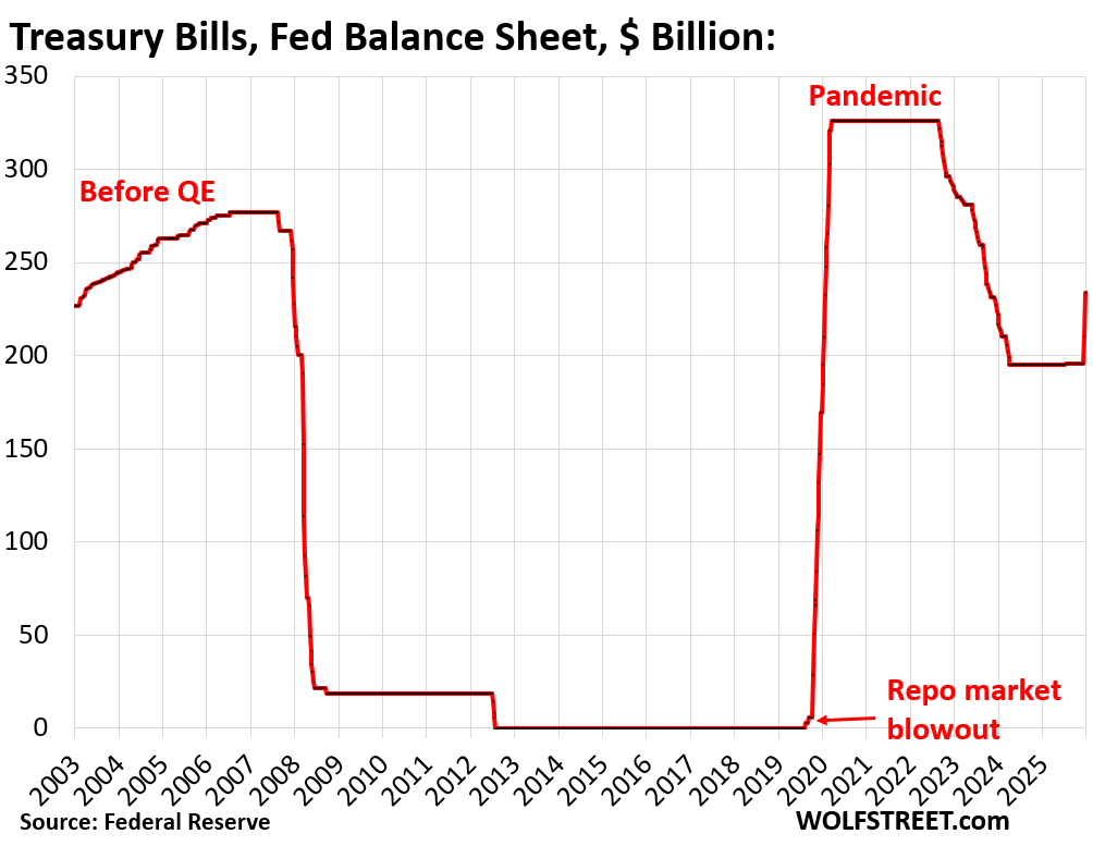 Treasury bills are at the core of the Fed’s new effort to change the composition of its balance sheet toward shorter-term securities. Until December, it held only a minuscule portion of its total assets in T-bills ($195 billion). Its assets are dominated by long-term MBS, Treasury notes (2-10 years) and Treasury bonds (20 and 30 years).
