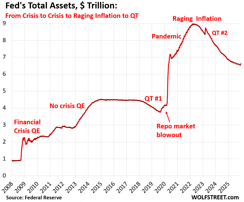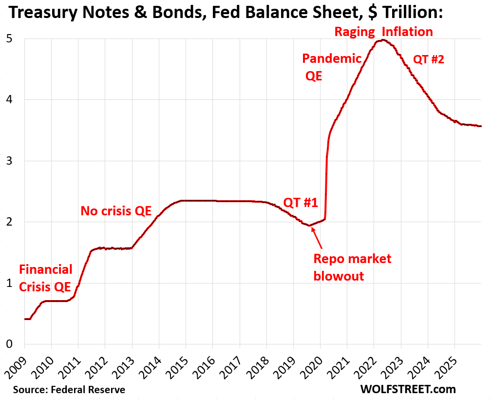 The pre-2008, pre-QE balance sheet: From January 2003 to August 2007, the Fed’s holdings of Treasury securities increased by 26% (blue line), and its total assets increased by 18% (red line), roughly with nominal GDP growth at the time. The jaggedness of the red line was a result of the Fed’s repo facility that the Fed used extensively at the time. This was not QE, but normal balance sheet management before Bernanke’s QE craziness came along. Growing the balance sheet in line with nominal economic growth is not QE.