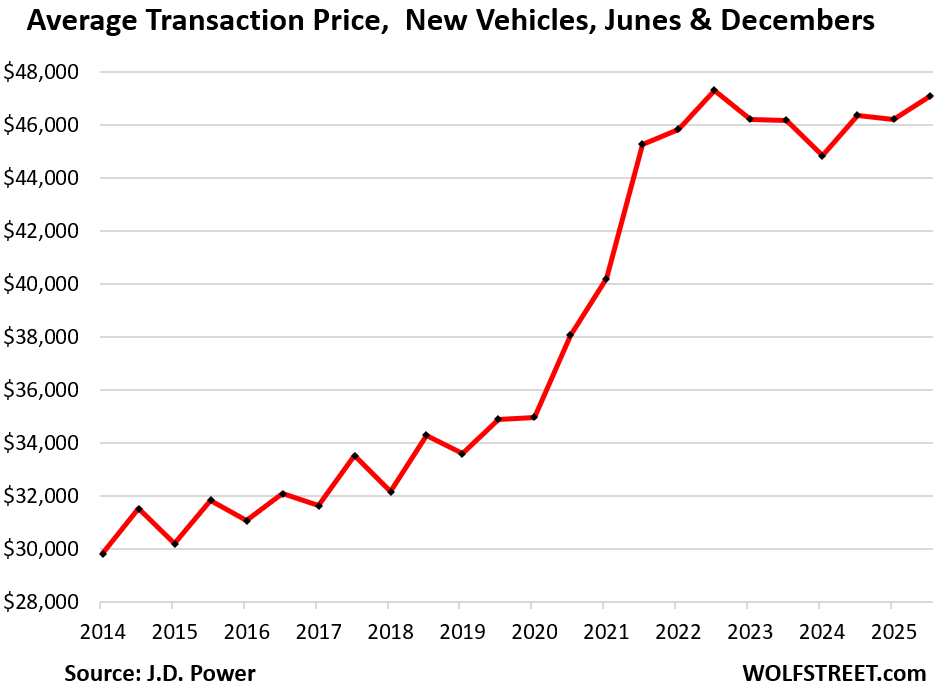 The result is that new vehicles are now too expensive. The average retail transaction price peaked at the end of 2022 at $47,329 and has remained roughly at that level since then. At the end of 2025, the average transaction price was $47,104, up by 1.5% from a year ago, and down by 0.5% from three years ago, according to JD Power estimates. The average retail transaction price includes all incentives and discounts.