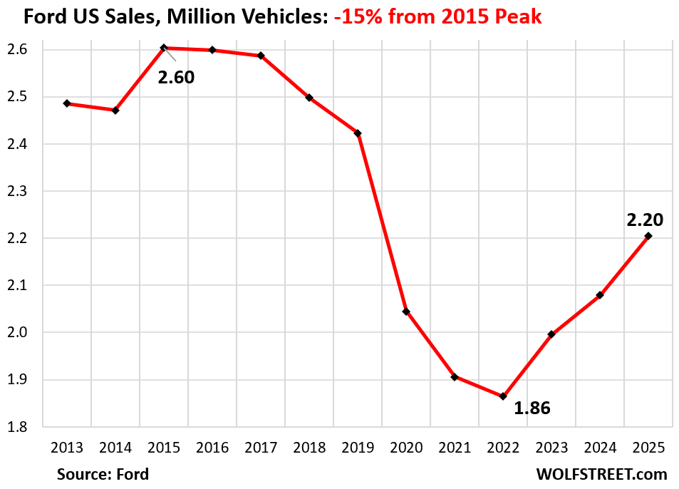 Stellantis continued its death spiral, with sales dropping further in 2025, down by 44% from the high in 2015; Nissan may have paused its death spiral, with sales roughly flat year-over-year, and down 42% from the 2017 high. GM’s and Ford’s sales have come up, but are still well below their 2015 levels. Honda also eked out a gain for the year, but sales were still down 13% from the peak in 2017. Toyota’s sales jumped and surpassed its 2015 record by a hair. Hyundai-Kia sales continued to surge from record to record. And Tesla doesn’t report US sales publicly – it only reports global sales publicly, which dropped for the second year in a row (overall new-vehicle sales data via Bureau of Economic Analysis):