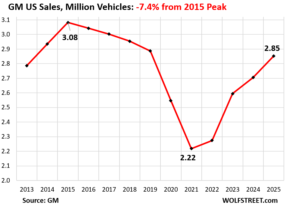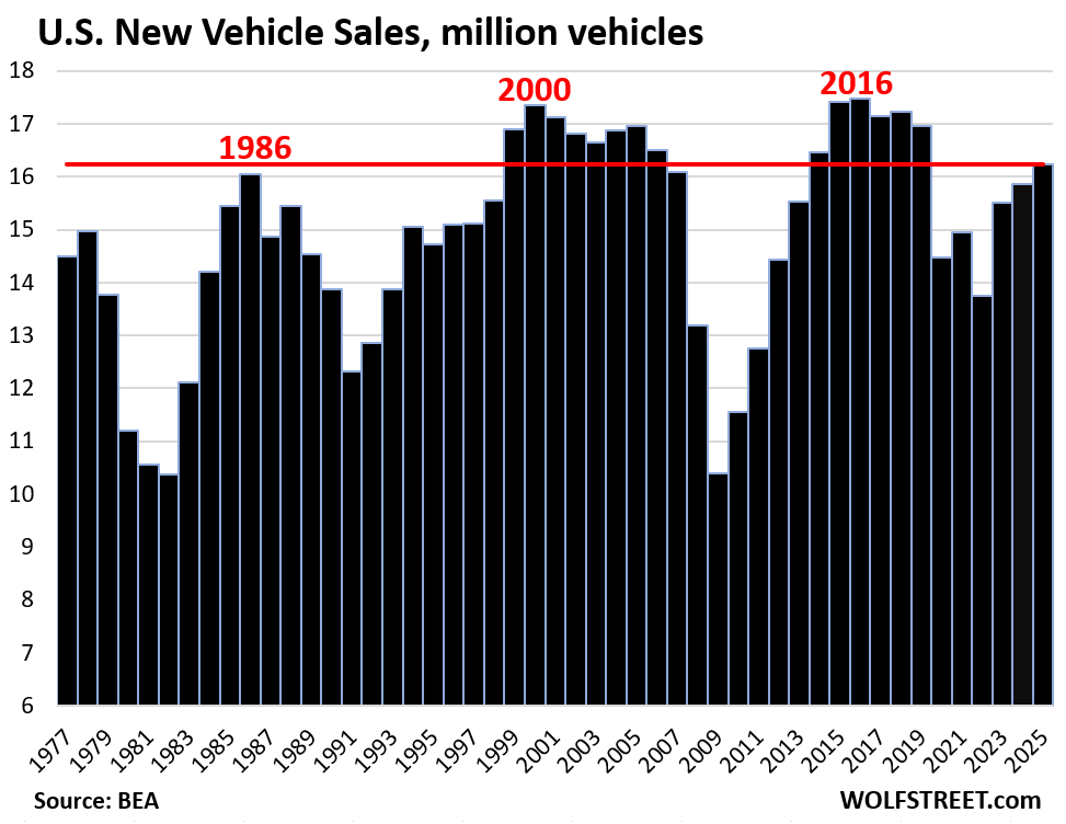Total new-vehicle sales, as measured by deliveries to end users, rose by 2.4% in 2025 to 16.2 million vehicles, the highest since 2019, and just a hair above where sales had been in 1986 – four decades of structural stagnation, plunges, and partial recoveries. The two best years were 2000 and 2016, with 17.4 million and 17.5 million vehicles sold. In 2025, sales were 6.4% below the year 2000. Over those 25 years, the US population has increased by 21%!