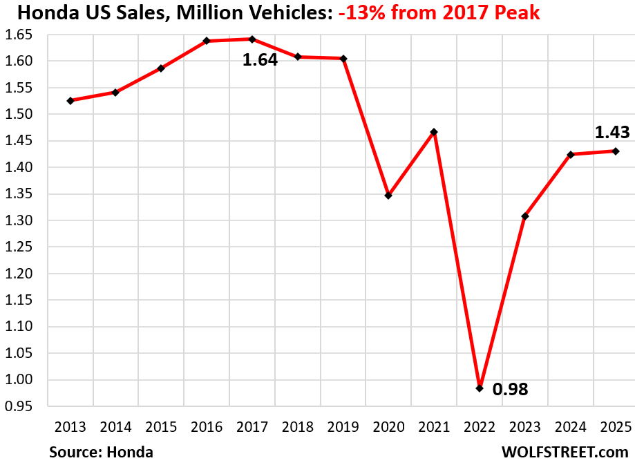 2025 was the second year that Honda was the #5 automaker in the US. In 2024, it had moved past Stellantis, whose sales had collapsed.