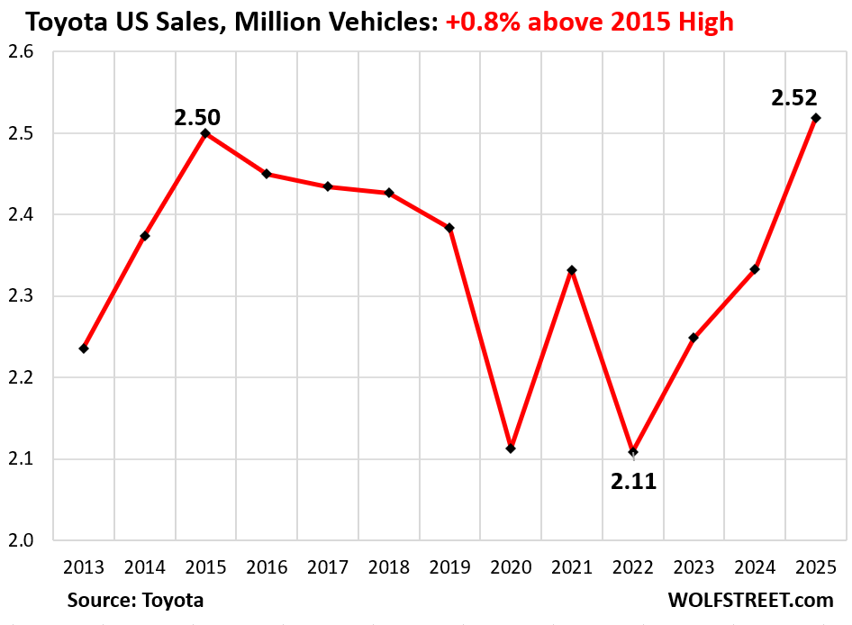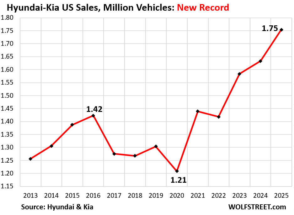 #4, Hyundai-Kia: Combined sales jumped by 7.4% in 2025, to a record 1.63 million vehicles, up by 26% from the 2015 high. Hyundai sales were up 7.8%, Kia sales 7.0%. But Q4 sales were barely up from a year ago.