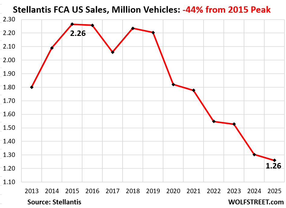 #6, FCA US (Stellantis): The death spiral continued in 2025. FCA US sales all brands combined – Jeep, Ram, Chrysler, Dodge, Fiat, and Alfa Romeo – dropped another 3% in 2025, to 1.26 million vehicles. From the recent peak in 2015, sales have collapsed by 44%.