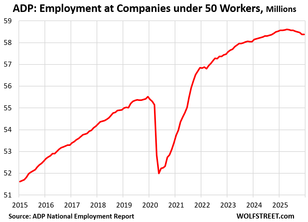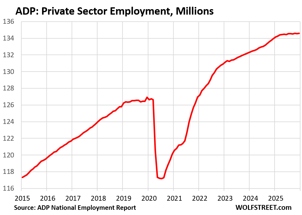 With the gains in December, payrolls rose to a record 134.59 million. The chart shows the trend: Private-sector job growth continued in 2025, but that growth was much slower than in prior years and slowed to a crawl in the second half.