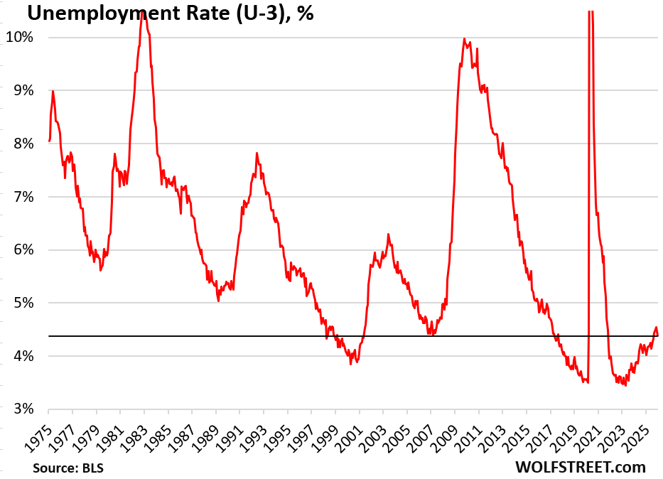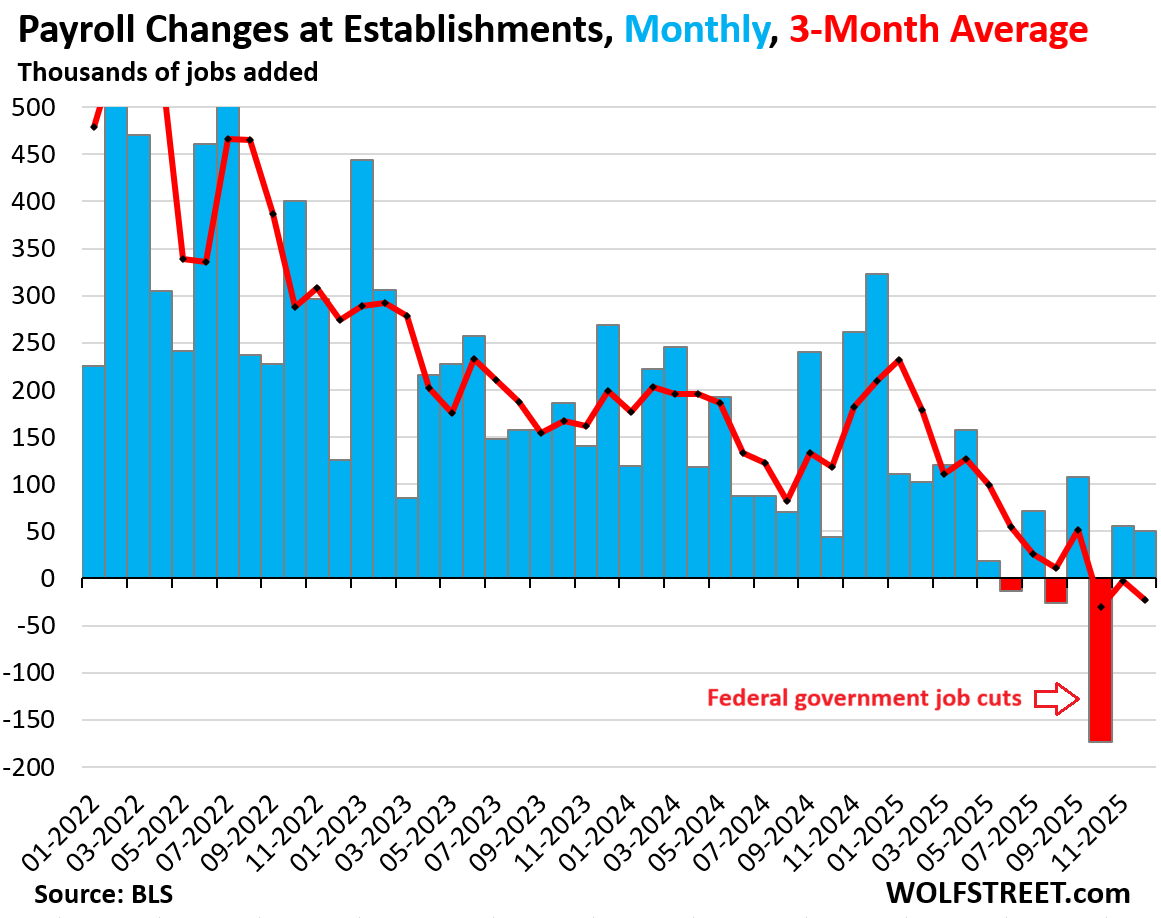 But the data below on the unemployment rate, labor force, etc. is collected via surveys from households. Surveys were not conducted in October during the government shutdown, and the data is missing forevermore. The November and December surveys were conducted.