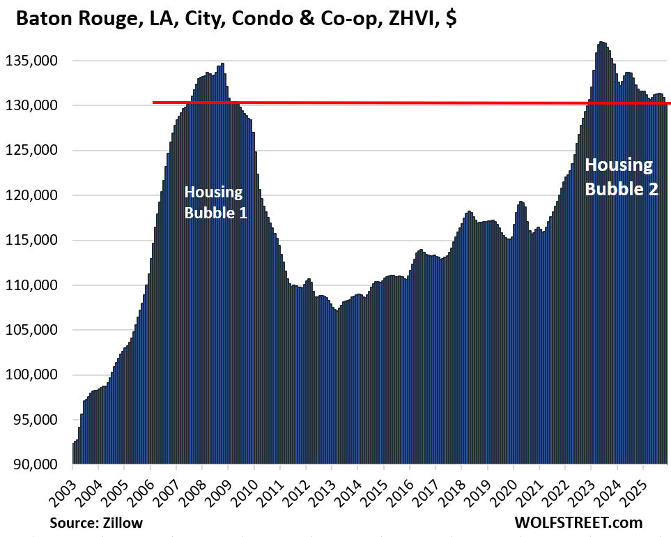 Baton Rouge, LA: Prices of mid-tier condos fell 0.6% in December, down 1.7% year-over-year, down 4% from the peak of Housing Bubble 1 in September 2008 and back where they’d first been in mid-2007.
