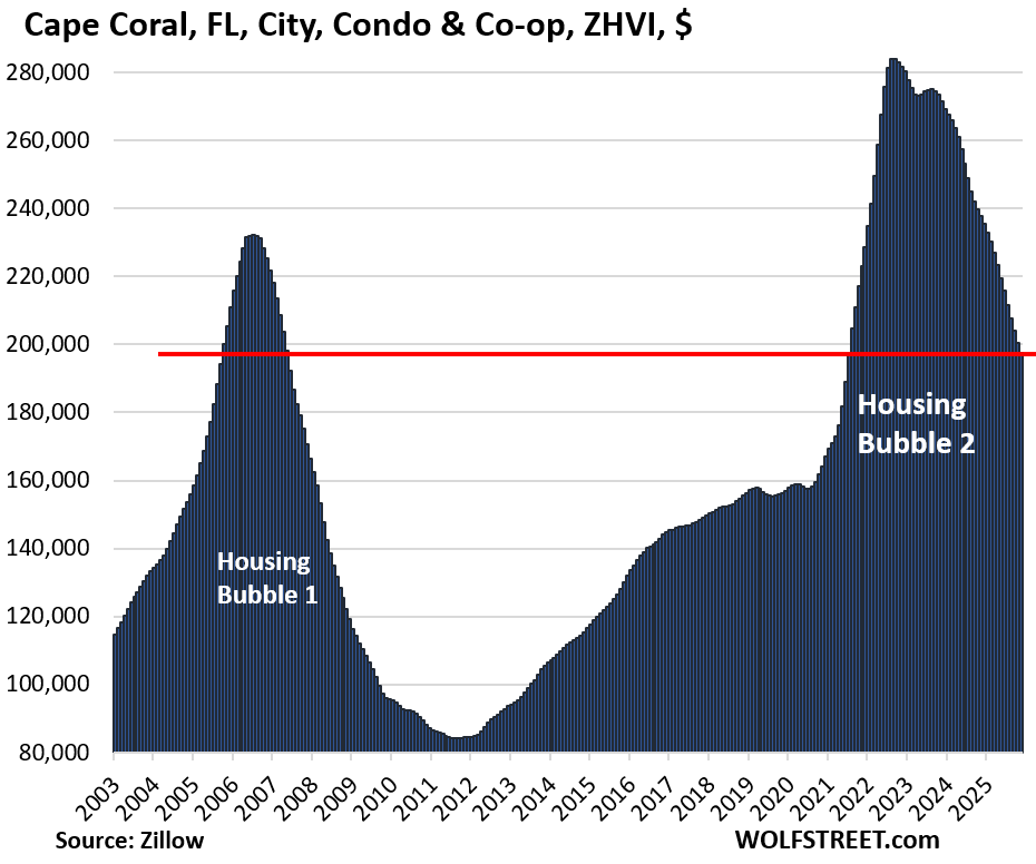 Cape Coral, FL, Epic Boom-Bust, Boom-Bust.: Prices of mid-tier condos in December plunged another 1.2% from November, and by 17% year-over-year. Since the peak in July 2022, prices have collapsed by 31%.