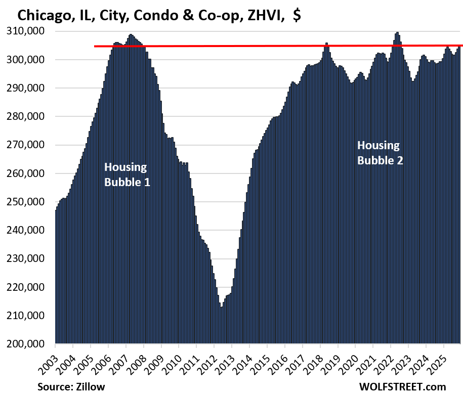 Chicago, IL: The City of Chicago – not the metropolitan area of Chicago – is one of the cities where Housing Bubble 1, in terms of condos, had been majestic, and the plunge afterwards had been even more majestic, and then there was another price surge, but it petered out, and prices have been wobbling along below the peak of Housing Bubble 1, piercing it only briefly a couple of times.