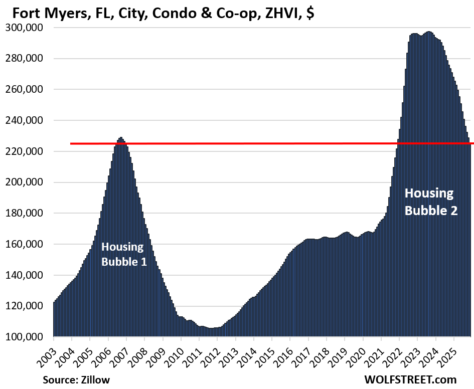 Fort Myers, FL, another Epic Boom-Bust, Boom-Bust: Prices of mid-tier condos plunged 1.0% in December from November and 17% year-over-year.