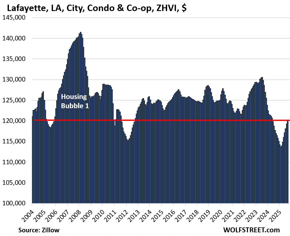But there are some markets that are special: Condo prices either plunged enough in this iteration of the Condo Bust or never rose enough to where current condo prices are below where they’d been at their respective peaks in 2005-2007 during Housing Bubble 1.