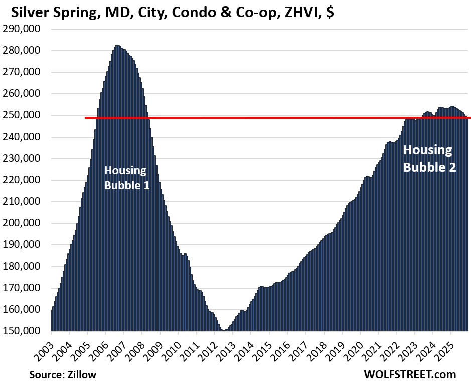 In Silver Spring, MD, which neighbors Washington DC, prices of mid-tier condos in December inched down 0.1% from November and by 1.9% year-over-year, and are now 12% below the peak in August 2006. During the phenomenal Housing Bubble 1, when prices of mid-tier condos exploded by 78%, before collapsing and giving up more than the entire gain by mid-2012.