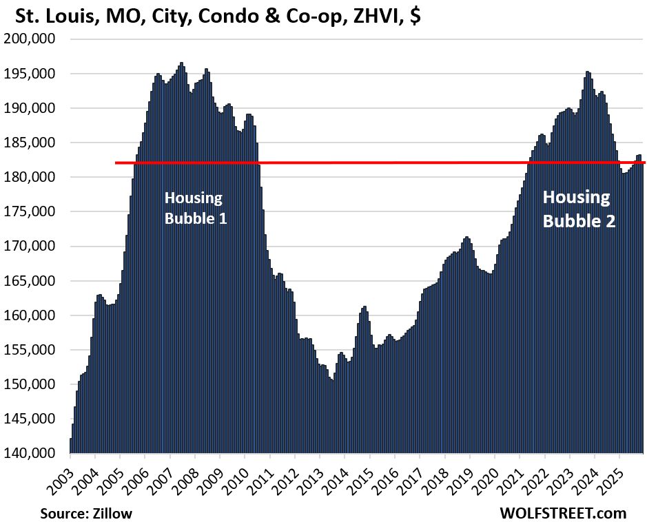 St. Louis, MO: Prices of mid-tier condos fell 0.9% in December and are down 1% year-over-year. The peak of Housing Bubble 2 (September 2023) didn’t quite make it back to the peak of Housing Bubble 1 (May 2007), before prices began to sag again, and in December 2025 were 8% below where it had been at the peak of Housing Bubble 1 in May 2007.